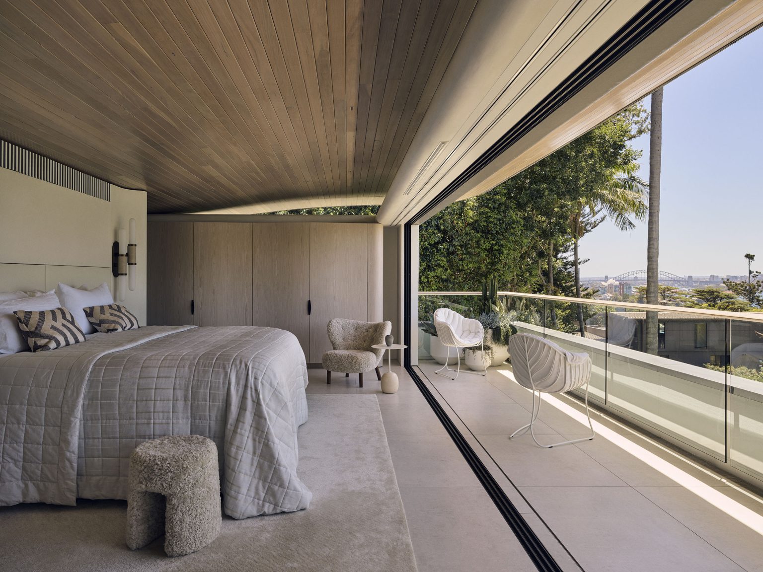 Barda House by Walter Barda Design and Stanwix Studios Interior Design unfolds as a masterful dialogue between architecture, landscape and light. Bathed in natural light and opening to expansive harbour views, the home celebrates organic form and refined materiality.