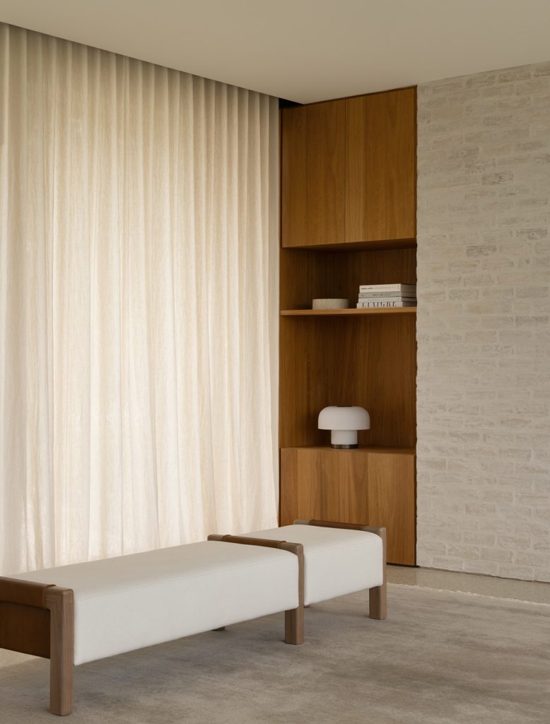 Articolo Studios Luxury Furniture Saddle bench in Walnut with Bone Linen and Pecan Leather Detail