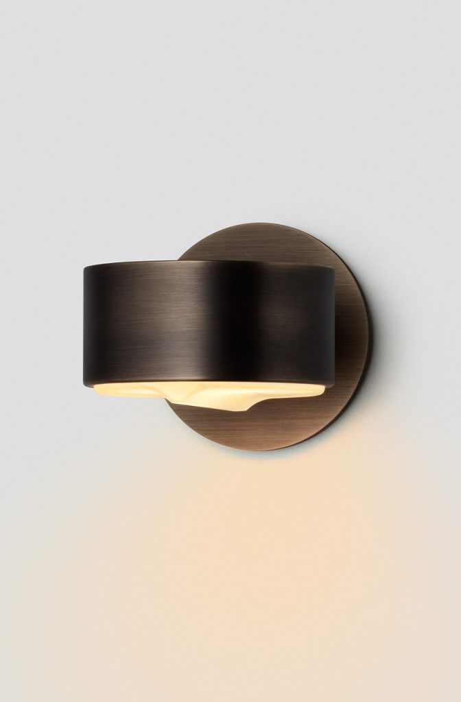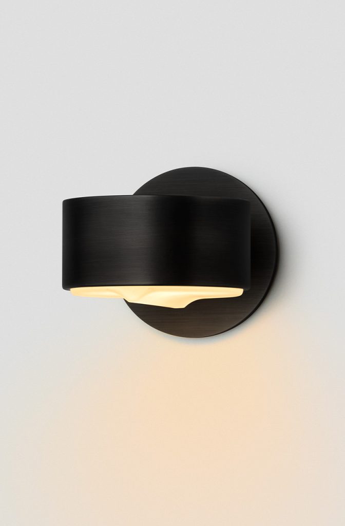 Occhi offers a bold contrast through its circular and linear forms, evoking a natural curiosity with its presence. Restrained by a cylindrical metal casing, a solid cast glass disc is defined by its raised striking linear strip detail, while its gently tumbled face offers subtly-nuanced light refraction.