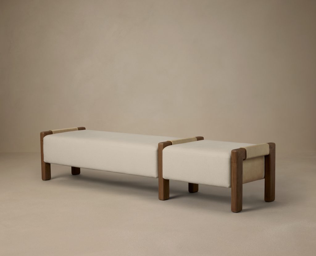 Saddle; cushions clad in a linen composite renowned for its durable properties are suspended in a stain proof leather sling uniting solid walnut legs. Handcrafted by artisans who share a meticulous devotion to proportion and comfort.