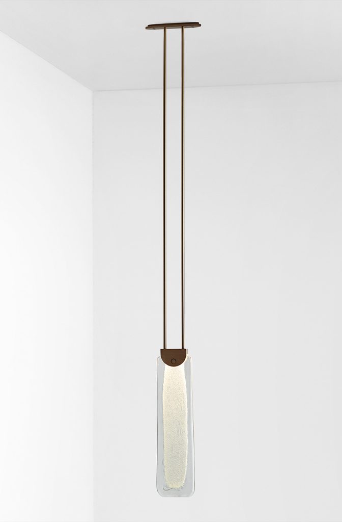 The Fizi Slab embodies sculptural light art. Dramatic elongated effervescence suspended within a solid glass sculptural form. Breathtaking in its unique and organic beauty. Wall and ceiling jewellery enchanting any space.