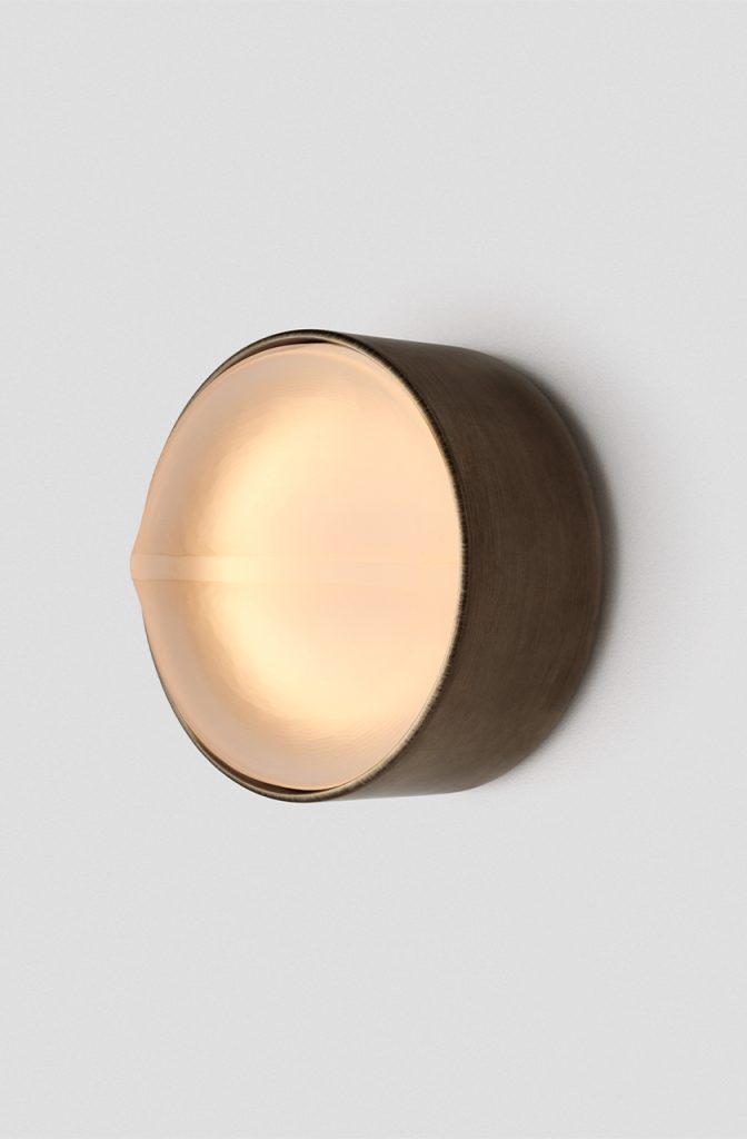 Occhi offers a bold contrast through its circular and linear forms, evoking a natural curiosity with its presence. Restrained by a cylindrical metal casing, a solid cast glass disc is defined by its raised striking linear strip detail, while its gently tumbled face offers subtly-nuanced light refraction.
