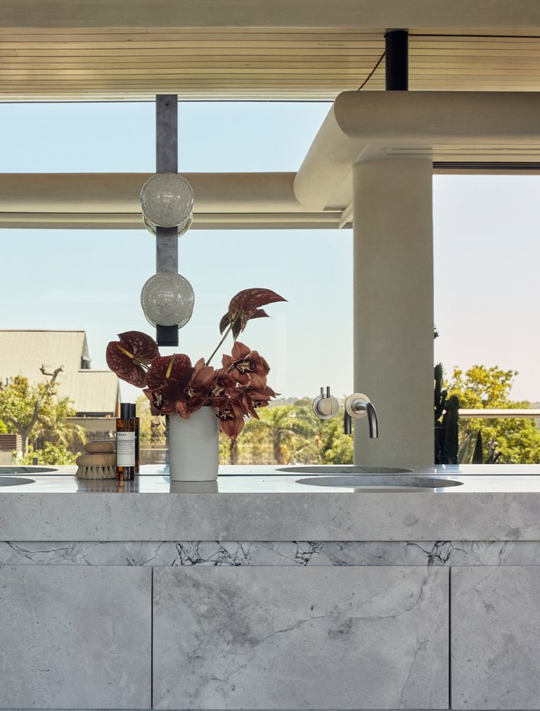 The Fizi Double Ball Wall Sconce finds expression in both the master ensuite and powder room, its effervescent glass spheres set against veined marble. Each piece captures the essence of the home, celebrating a commitment to artisanal craft and quality workmanship.